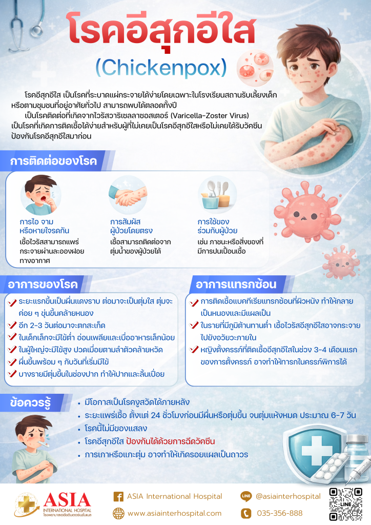 โรคอีสุกอีใส หรือ Chickenpox เป็นโรคติดเชื้อไวรัสที่พบได้บ่อย โดยเฉพาะในเด็ก มักระบาดได้ง่ายในโรงเรียน สถานรับเลี้ยงเด็ก หรือในชุมชนที่มีการอยู่รวมกันจำนวนมาก โรคนี้เกิดจากเชื้อไวรัส Varicella-Zoster Virus (VZV) ซึ่งเป็นเชื้อเดียวกับที่ทำให้เกิดโรคงูสวัดในภายหลัง