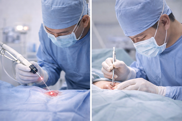 แนวทางมาตรฐาน: เลือกวิธีผ่าตัดที่เหมาะสม เช่น เลเซอร์หรือเทคนิคแผลเล็ก เพื่อลดอาการเจ็บและช่วยให้ฟื้นตัวไว (ตามดุลยพินิจแพทย์)
