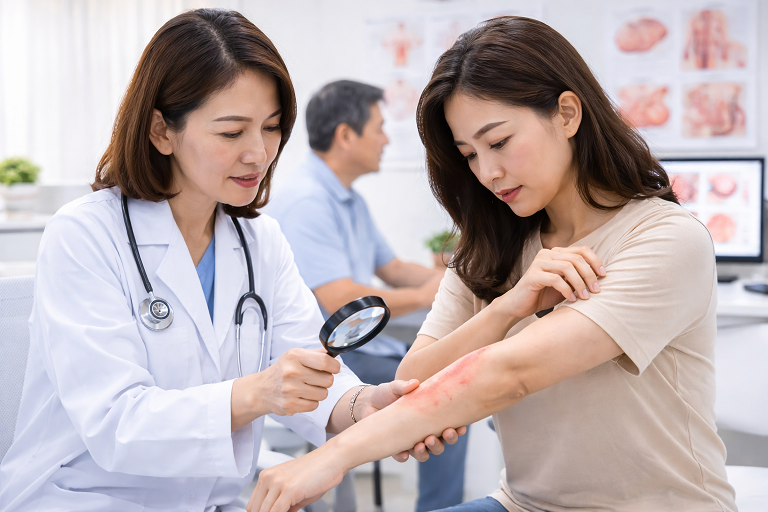 – ซักประวัติ + ตรวจร่างกายเพื่อแยกสาเหตุผื่น/คัน/อักเสบ